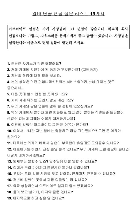 첫알바 면접보는 20살입니다. 인터넷에서 보면 면접볼때 이런 질문들이 나온다고 하는데 정말인가요? 그러면 전에 미리 예상 답변 준비해서 가는게 나을까요? 그리고 면접 시간은 어느정도 걸리나요??