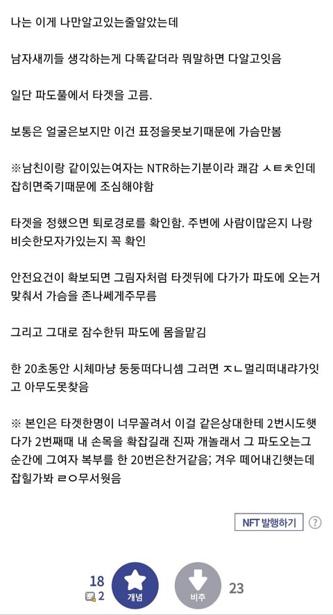파도풀에서 성추행하고 튀는 남자들 있고 실제로 당한 여자들도 꽤 된대 근데 신고도 못해가지고 그냥 당하고 있는 수밖에 없다더라