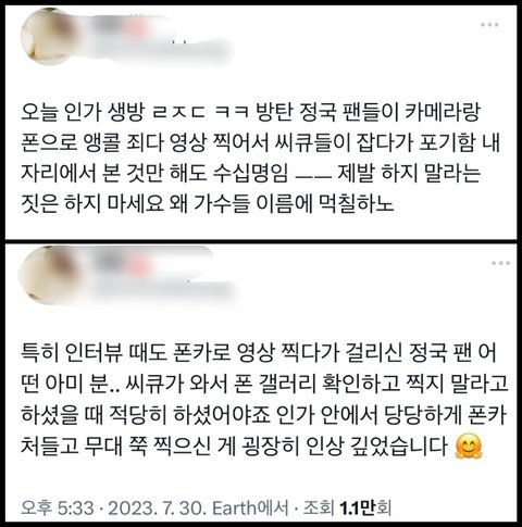 음방 촬금인데 방탄 정국팬들 촬영하는거 씨큐가 막았는데