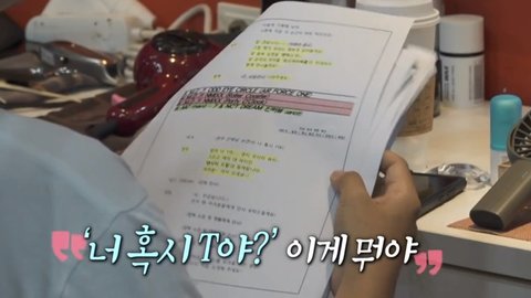 대본을 보다가 "너 혹시 T야?" 라는 걸 보고 이게 뭐냐고 하는데 ㅋ