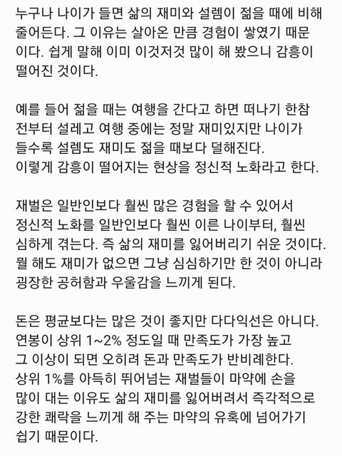 돈이 너무 많아도 안좋은거예요.. 그러면 돈 다 기부하고 평범하게 살면 되지 않냐고 생각할 수도 있겠지만 이미 올라가버린 행복의 역치는 그렇게 한다고 다시 내려가지 않아요