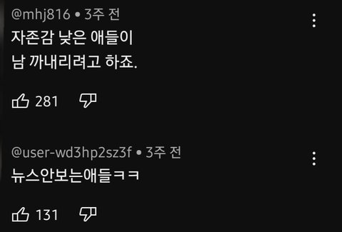 https://youtube.com/shorts/SDEtV29r5XI?feature=share ㅂㅌ얘기 나오니까 누가 챗창에 ㅇㄱㄹ끌어서 너튜버가 먹금시키는영상인데 다른 댓글들도 방뽕 오져