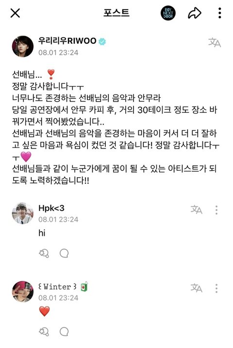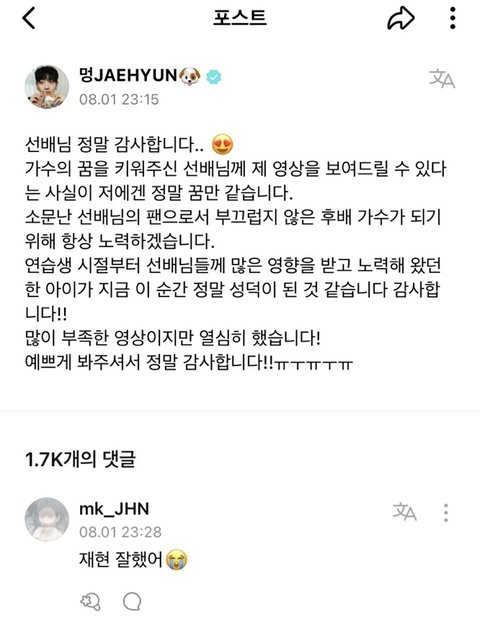 보넥도 명재현 리우 무한감격 수상소감글 남김ㅋㅋ큐큐