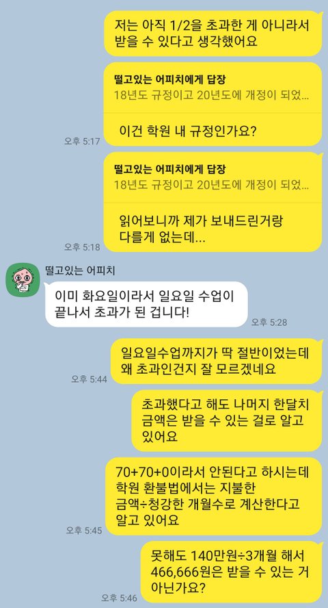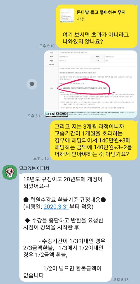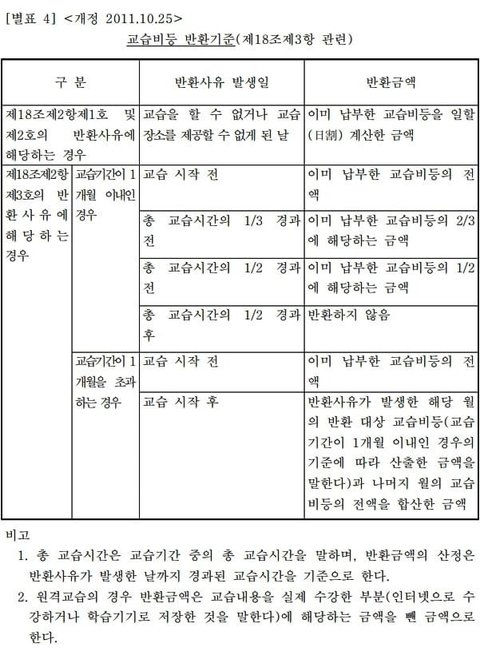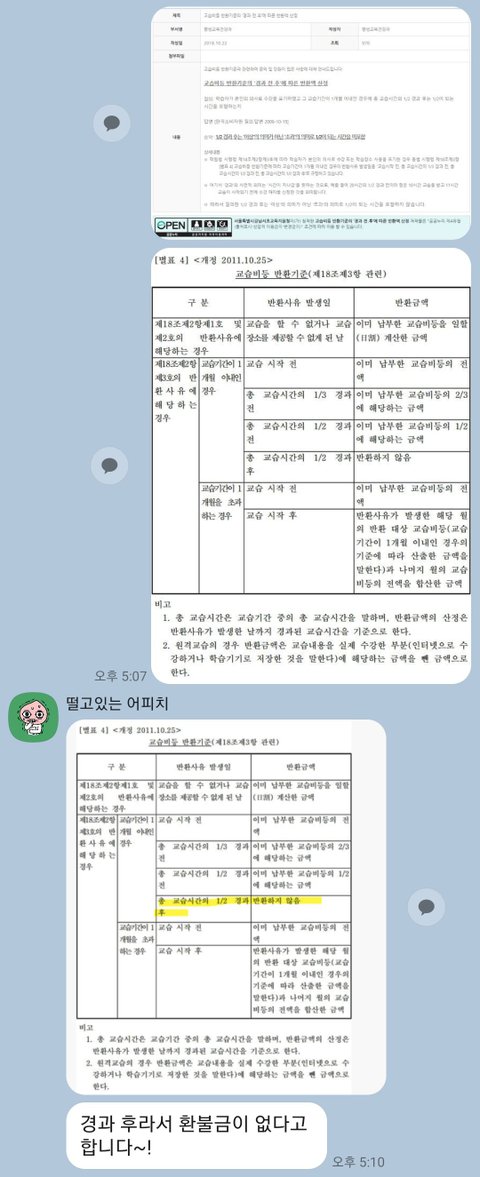 저는 3개월 코스 수업을 듣고 있기 때문에 교습기간이 1개월을 초과한 경우입니다.따라서 아직 듣지 않은 1개월치와 남은 2주치의 금액을 반환받을 수 있습니다.하지만 멘토님은 수업과정의 1/2을 경과하면 환불이 불가능하다는 대목을 반복하십니다.보시다시피 그 경우는 교습기간이 1개월 미만일 경우입니다.3개월 코스 수업을 듣는 제가 환불받지 못할 이유가 없습니다.다 떠나서 1/2을 경과한 적이 없는데 교습기간이 어찌되었든 남은 절반은 환불받아야하는 것 아닌가요?
