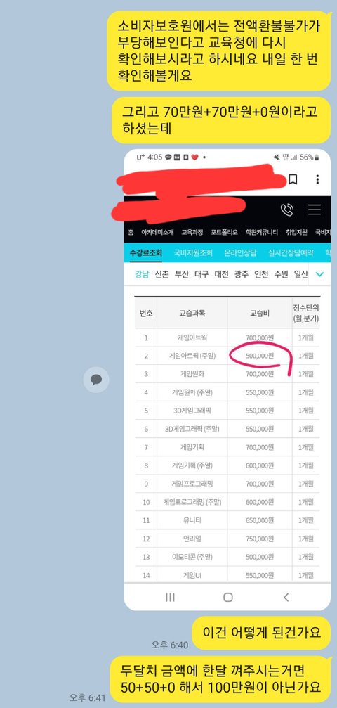 (제가 수강하는 과목은 게임아트웍 주말반입니다)서두에 말씀드렸듯이 제가 듣는 수업은 한 달에 70만원으로 총 140만원입니다. 하지만 이 금액은 평일반일 경우에만 해당하는 것이죠.저는 개강 전에 이미 주말반으로 옮긴 상태였고 첫수업부터 지금까지 주말반 수업만 들어왔습니다. 그렇기 때문에 한 달에 50만원, 총 100만원을 내야하는 것이 맞고 주말반으로 옮겼을 때 40만원을 환불받아야 했었습니다.하지만 학원 측에서는 평일반과 주말반 가격이 다르다는 것을 알려주지 않았고 이 사실을 몰랐던 저는 140만원 그대로 주말반 수업을 들었습니다.이런데도 제가 받을 금액이 아예 없다고 할 수 있나요?