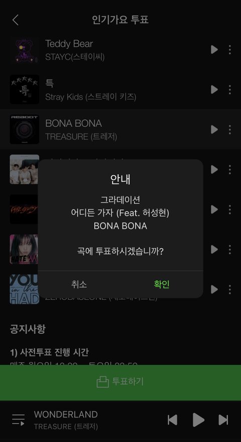 멜론>이벤트> 상단 배너 클릭> 트레저 외 다른 가수 2명 선택