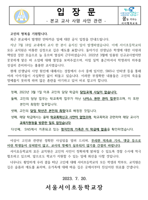 서이초는 책임전가하고 사건 수습하기 바쁘네요 입장문 봤어요?