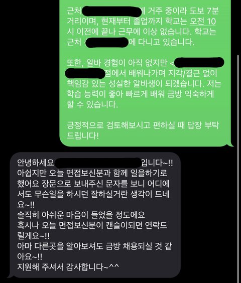 평소에도 자주 시켜먹던 곳인데 알바 공고 올라왔길래 미성년자 안 받는다고 써있었지만 너무 하고 싶어서 일단 문자 보냈더니 답장이 너무 친절하게 와서 기분이 너무 좋아 앞으로도 자주 시켜먹어야딩~
