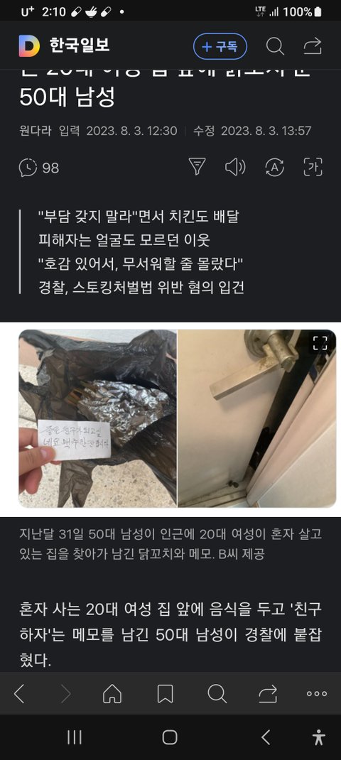 오피스텔 거주 자주 배달시켜먹음 어느날 피자 배달을 시켰음 문앞에 두고 갔단 문자받고 나가려는데 비닐부시럭대는 소리들림 배달기사분이 아직 안갔나 하고 좀 기다렸다가 나감 피자박스가 비닐로 씌워져있고 비닐 위에 포스트잇으로 제마음입니다 라고 써붙여진 쪽지와 비타오백이 얹어져있음 비닐안에 있으면 이상한게 아닌데 비닐위에 있다는건 배달원이 굳이 따로 들고와서 얹었다는거니까 찜찜해서 옆에 밀어놓고 피자만 들고 들어옴 한시간쯤 있다가 누가 벨누름 누구냐하니 아까 왔던 배달기사래 뭔일이냐 하니 왜 음료수는 안가지고 들어갔냐길래 기사님이 준거냐 하니까 아무말 안하더니 가게측 서비스래 자기가 딴집 배달오다보니 이것만 문앞에 있길래 챙겨가라고 얘기하는거라길래 알겠다고 이따 챙길테니 거기둬라하니까 알겠다 하는데 가는 발소리가 안들림 문앞에서 전화하는척하면서 경찰서죠 여기 ㅇㅇ오피스텔 어쩌고하니까 그제야 부시럭대면서 가는 소리들림 한참있다가 나가니까 음료 사라짐 경비실에 얘기해서 입구 씨씨티비보니까 음식봉투없이 헬멧쓰고 들어왔다가 비타오백으로 보이는 병은 주머니에 넣고 노란 보스트잇은 입구앞 쓰레기통에 버리는거 찍힘 경찰신고 했는데 범죄로 보이는 정황은 없다길래 그냥 이사했음