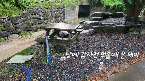 계곡 옆에 있는 나무테이블 하나와 저희꺼 테이블 하나 두개 사용해서 감자전에 닭도리탕 먹고 사장님도 오셔서 옥수수 같이 드시고, 본인 피셜 엄청 하시기에 그냥 듣고 참고 넘겼습니다. 그때까지만 해도 성격이 있으시지만 좋은 분이라고 착각을 했습니다. 맨처음 텐트 칠때 테이블 부족하면 가져다 써라 하시면 옆옆 사이트에 있는 나무테이블을 가리키셨습니다. 가져온 테이블이 있으니 그냥 쓰다가 저녁에는 사장님께서 추천해준 테이블에서