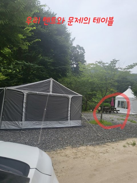 그거에는 대답 안하고 낮에 계곡 옆에 있는거 쓴것도 내가 아무말 안하고 참지 않았냐…낮에 썼으면 저녁에 쓰지 말아야 하는거라고.. 뭔소리지.. 펜션객들을 위한 테이블인데 캠핑장에 위치해 있고,