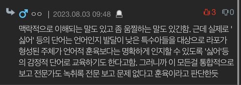 ..? 그 전문가란 분도 자폐쪽 전문가는 아니고 특수교육-즉 모든 신체장애, 지적장애 포함 교육 환경 전문가시고요. 게다가 그분도 자폐스펙트럼 아이들 교육할때 싫어란 표현을 쓰기도 한단 말씀은 안하셨는데요? 주호민이 싫은건 싫은건데 자폐치료 교육 마저 허위로 유포하지 말란게 잘못 된 말인가요? 싫어란 표현을 쓰면서 아이들하게 교육하지않습니다. 그것마저 허위로 호도하지마세요. 그것마저 진실이라고 우기는 분들은 눈과 귀가 멀어서 그냥 악플다는것이라고 밖에 생각이 안되네요.