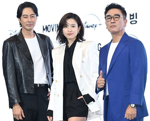 디즈니+(플러스) 새 오리지널 시리즈 '무빙'의 제작발표회가 3일 진행됐다. 이 날 박인제 감독과 강풀 작가를 비롯해 배우 류승룡, 한효주, 조인성, 차태현, 김성균, 김희원, 이정하, 고윤정, 김도훈이 참석했다.