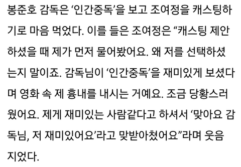 그 때 연기를 재밌게 본 봉준호 감독이 기억했다가 기생충 연교 역으로 캐스팅함