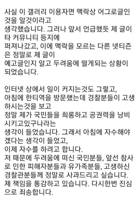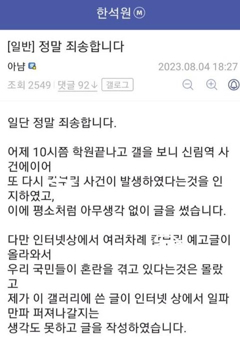 한티역 칼부림 예고 디시남 사과문 봄? ㅋㅋㅋ