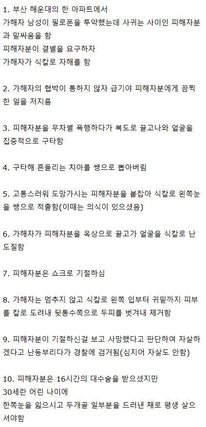 내가 본 사고 중에 가장 혐오스러운 사고 이건 진짜 보고 또 봐도 믿겨지지 않음 아무리 마약을 먹었어도 이럴 수가 있나? 사람이 한 짓이 맞는 건가? 의구심이 들정도임. 심지어 이거 피해자분이 치료비용 때문에 돈 오천만원 받고 합의 해줘서 30년 구형 받은거 20년으로 감형받았다고 함. 진짜 인류애 바사삭이야;;;;;