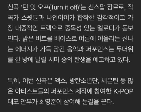 다들 시간 된다면 나인나이 Turn it off 한번씩 들어줘!! 노래 너무 좋고 안무도 너무 귀엽고 최영준 안무가 께서 만드신 안무야!!
