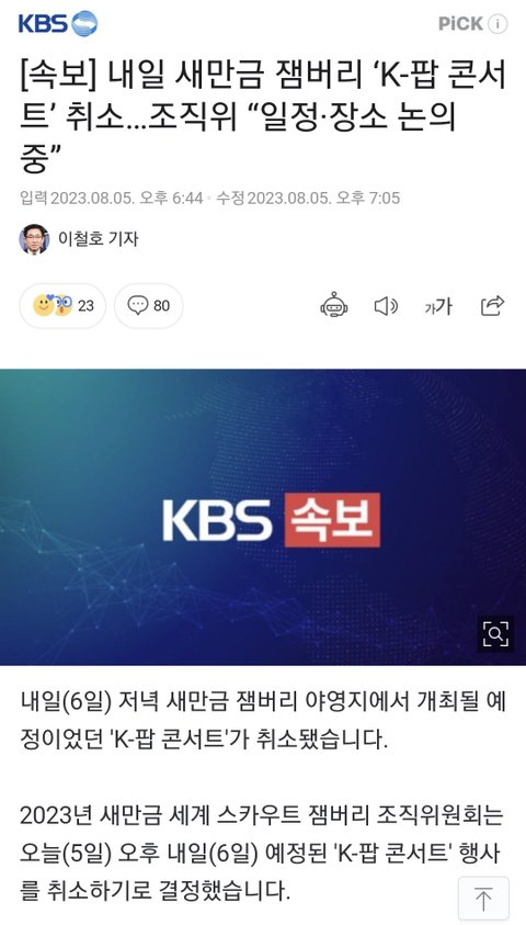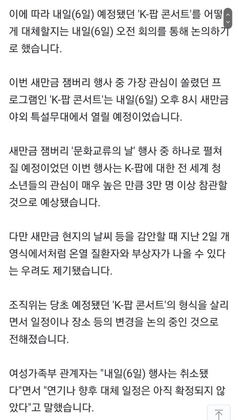 잼버리 자체가 중단인지는 모르겠는데 일단 케이팝 콘서트 취소는 맞는 것 같아