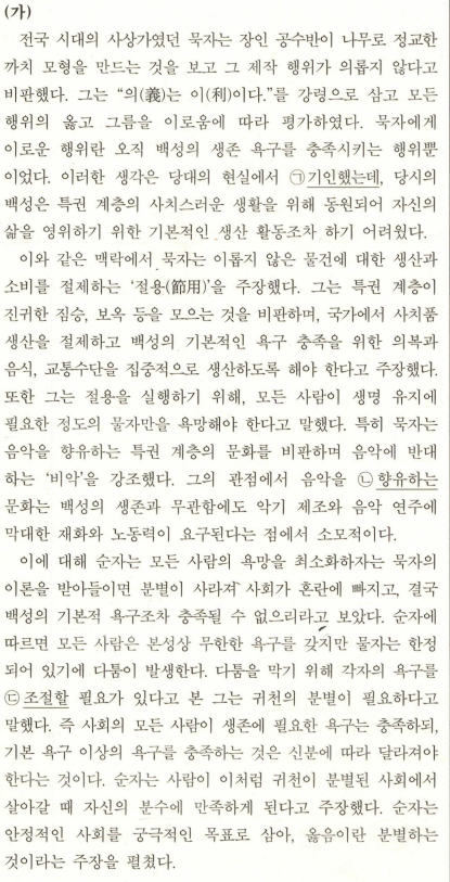 -2문단 살기 각박했기 때문에 물건에 대한 소비와 생산을 절제해야 하는 절용이 필요하네 그래서 절용이 뭐 어쩌라고 이게 정보 끝? 아 아니네 모든 사람이 생명 유지에 필요한 정도만 욕망해야 되겠네 뒤에 음악으로 예시가 나오네? 음악은 생존 욕구를 충족시키는 행위가 아니니까 당연히 비판의 대상이겠다