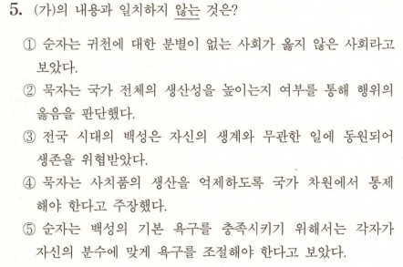 이 문제는 5초만에 1번 읽고 2번을 보고 묵자는 소비랑 생산 절제인데 개소리네 하고 찍고 넘어갔음