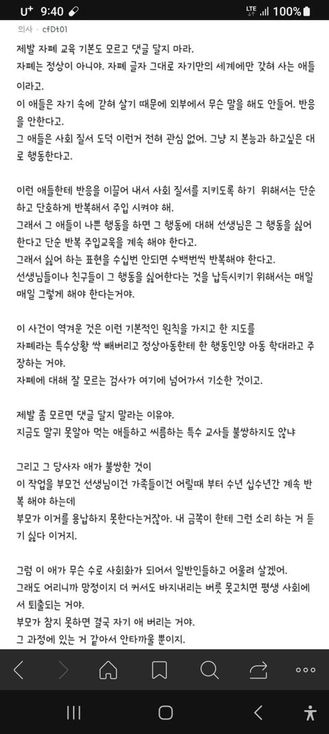 자폐아를 정상아로 봐서 생긴 오류 진짜 ㅇㅈ. 특수교사가 왜 특수교사겠냐고. 애초에 일반 교사랑 똑같은 일을 하면 특수교사가 아니지 않음? 그들만의 교육법이라는 게 있고, 그걸 대학에서 몇 년간 배우고 임용 합격해서 교단에 섰을텐데, 아무것도 모르는 일반인들이 왈가왈부 하는 거 진짜 같잖음. 최근에 중립 박는다니 뭐니 글 썼던 애가 이거 좀 봤음 좋겠네.