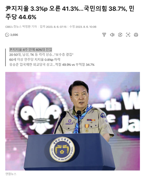 윤석열 대통령의 국정 지지율이 지난 주 대비 3.3%포인트(p) 오른 41.3%를 기록했다는 여론조사 결과가 6일 나왔다.