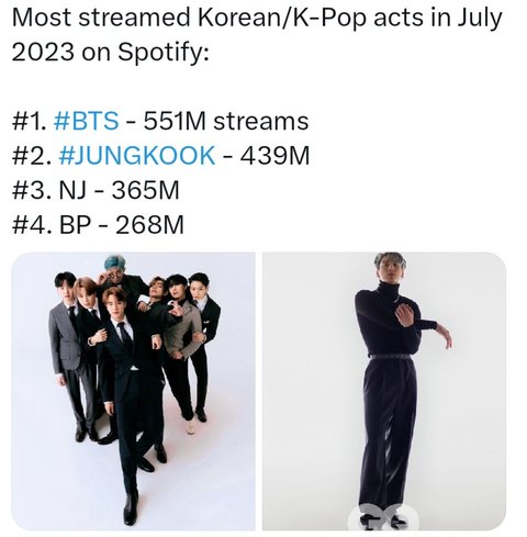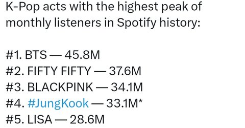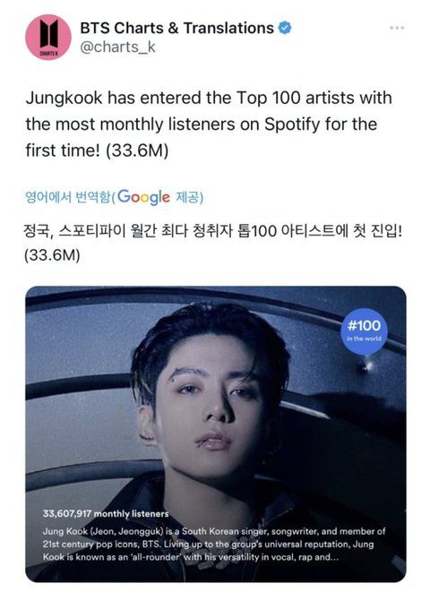 스포티파이 월간 리스너는 스포티파이 오픈때부터 계정열린 기존 팝가수들이 누적수치로 높은게 당연한건데 무슨 해리스타일스랑 테일러 스위프트를 끌고와 ㅋㅋㅋㅋㅋ 정국은 계정 생긴지 이제 1년이고 전체곡수가 겨우 6곡뿐임 그런데도 탑100에 든거고 십수년 몇년 이상 앨범 몇장씩 내고 곡수도 백개 넘는 타가수들이랑 같냐? 비교하는 것도 ㅈㄴ 멍청해 ㅋㅋㅋㅋㅋ