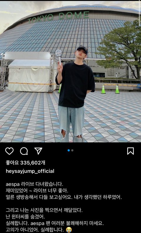 센터멤? 인기멤이 야마다 료스케인데 그룹 공식 인스타에 에스파 콘서트 인증샷 올리고 실수로 윈터 가렸다고 귀엽게 사과해놓음 ㅋㅋㅋ