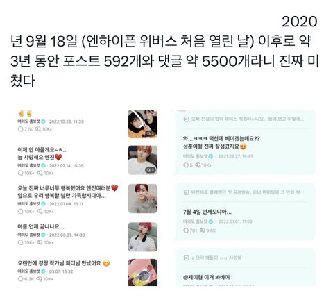 3년 동안 위버스 포스트 592개에 댓글 5500개…ㅋ