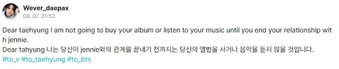 태형의 앨범을 응원할 건가요? 앨범 부진하면 태형과 제니 관계 끊는다
