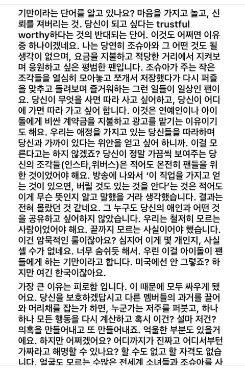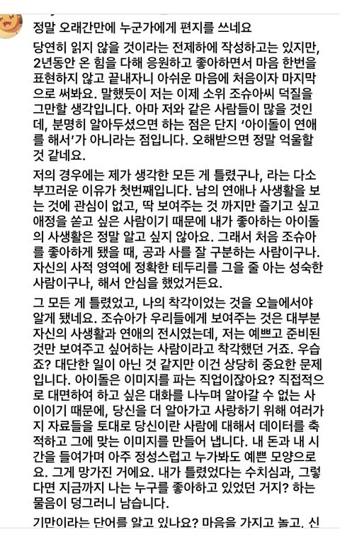 에휴 근데 난 팬들 편지니 탈덕문이니도 안 썼으면 좋겠어 시간이 아깝고 감정이 아깝다 어짜피 쟤들은 읽지도 않어