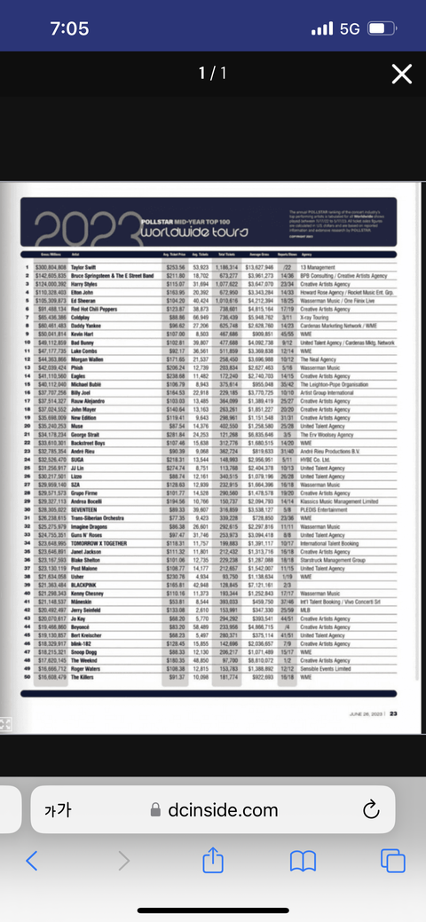 케이팝 올해 상반기 투어링 순위
