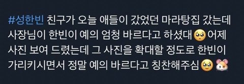 뭐 얼마나 예의 바르길래 잠깐 다녀간 카페 마라탕집 타투샵에서 예의 바르다는 말이 나오는거지.. 1~2시간? 짧은 시간동안 뭘 해야 저런 인상이 남냐고 진짜 미쳤다
