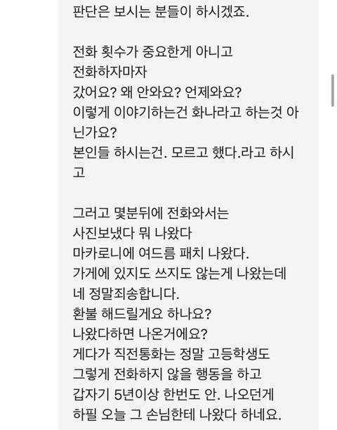 음식 먹다가 마카로니에서 여드름패치 같은게 나와서 제가 두번째 전화 했을때 사장님이 개인폰으로 저한테 퀵 아져씨랑 통화한 내용을 전달해주신다고 전화하신 번호가 있어 가게에 전화 안하고 바로 전화했는데 안받으시길래 문자 남겼습니디