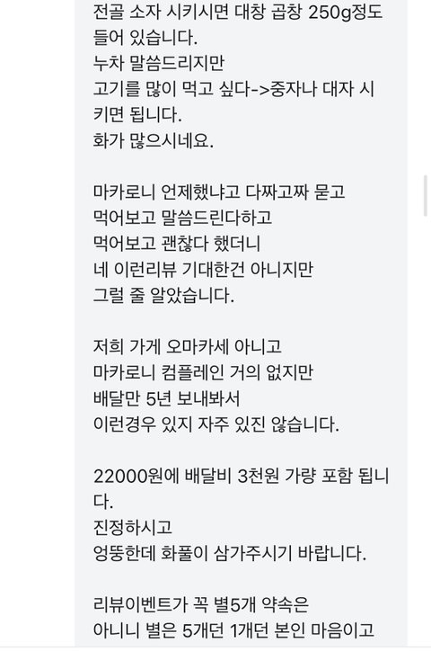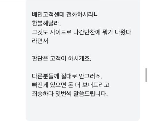 +고객센터 저나해서 환불 애기 꺼낸적도 없어요 사장님 왜 거짓말하세요 그럼 사장님이 느끼신 저희 말투가 그랬다는데 사장님 말투는 친절하셨나요 ? 사람마다 언제오나요 ? 이걸 다르게 말할수 있는데 주소 애기안하고 두번째로 전화 했을때 언제와요 ? 했다고 음식에 뭐가 나와서 전화 안받아서 문자 남겼는데 저렇게 대응하는게 맞나요 ? 환불은 사장님이 배민통해서 안댄다고 했다고 전달 들은거 밖에 없고요 전 제 입에서 한번도 환불 단어 꺼낸적 없습니다