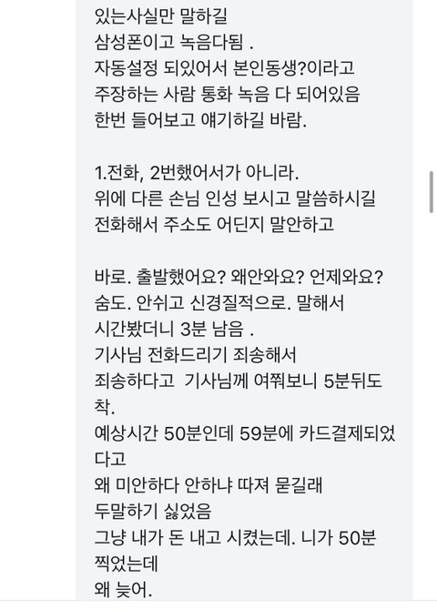 인성 문제 거들먹 거리시는데 제가 문자로 애기 드렸죠 전에 한번 저나해서 주소 아는줄 알고 언제오냐고 물었다고요 그럼 모든 사람이 사장님한테 친절하게 주소어디고 언재오냐요 상냥하게 말하나요 ? 그니깐 문자로 녹음한거 보내주세요 들어볼께요 배달예상시간 45분입니다 50분이 아니고 제가 배달 늦었다고 사장님한테 문자 보냈습니까 ?