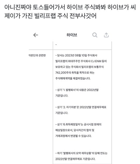 야 대박 하이브에서 빌리프랩 주식 전부 사감
