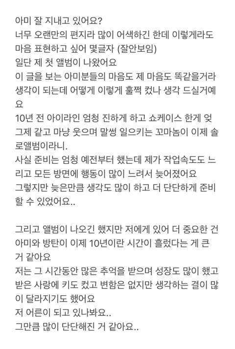 태형이가 앨범에 편지 쓴건데 이것도 같이 봐줘 진짜 감동임 두장정도 썼던데 아직 흐릿해서 잘 안 보이는 부분도 있음! 여기 뒤에도 보고 싶은 사람은 https://twitter.com/cooing_tae/status/1688719385278713856?s=46 t=rg7Y28bSZHgJnm3i5rbUJg 여기서 봐!