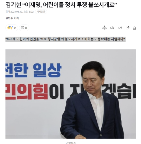 그러면서 "세상에 이러고서도 아동 인권을 감히 얘기할 수 있나. '사람이 먼저'라는 구호는 허울 좋은 립서비스인가. 아직 정치적 판단력이 미성숙된 6∼8세 아동을 이렇게 홍위병으로 내세워도 되는 건가"라며 "이건 아동 학대에 해당된다"고 거듭 지적했다.