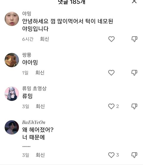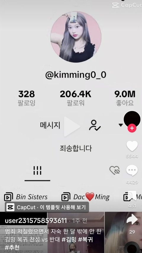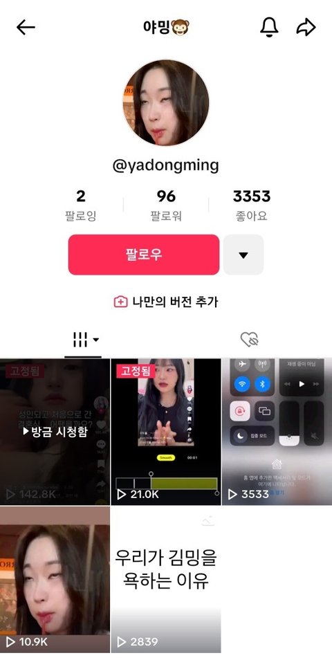 이런영상 추천에 도배되는중 틱톡잼민이들은 생각이없나봐 이러다 사람 죽으면 지들이 죽인거라는 걸 모를까? 그냥 난 김밍이 너무 안타까움 나이도 찾아보니까 04라던데..