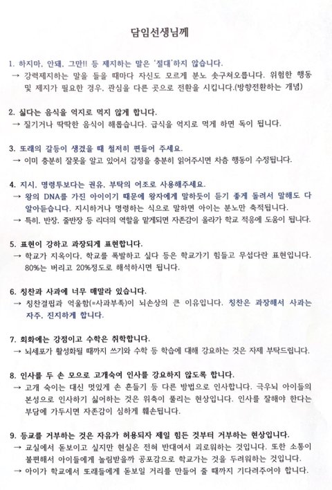 <학부모(직업: 교육부 5급 공무원)가 새로 부임한 담임 교사에게 보낸 편지(첨부 사진 참조)>