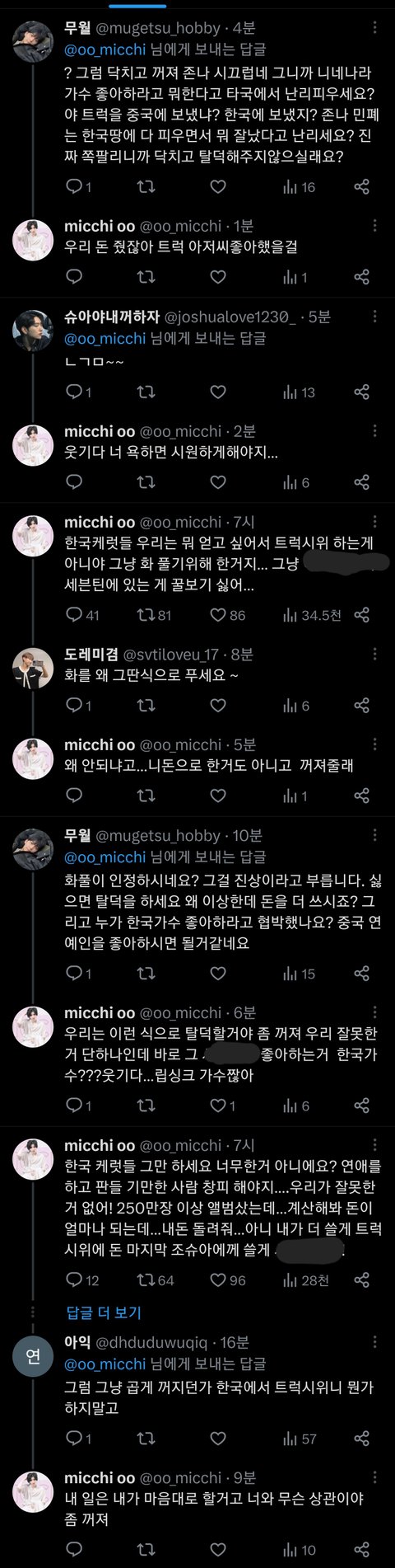 세븐틴 아니라도 한국돌 오래 덕질하는 중국팬보면 진짜 한국인 아닐까싶을정도로 말빨 장난아니고 직구임 ㅎㄷㄷ 한국에 흔한 병크돌 노예빠수니들보다 훨 낫다고 본다 저럴 자격있지