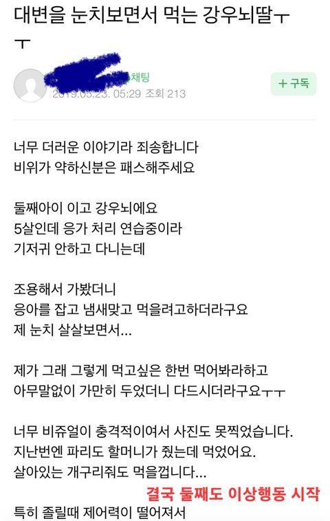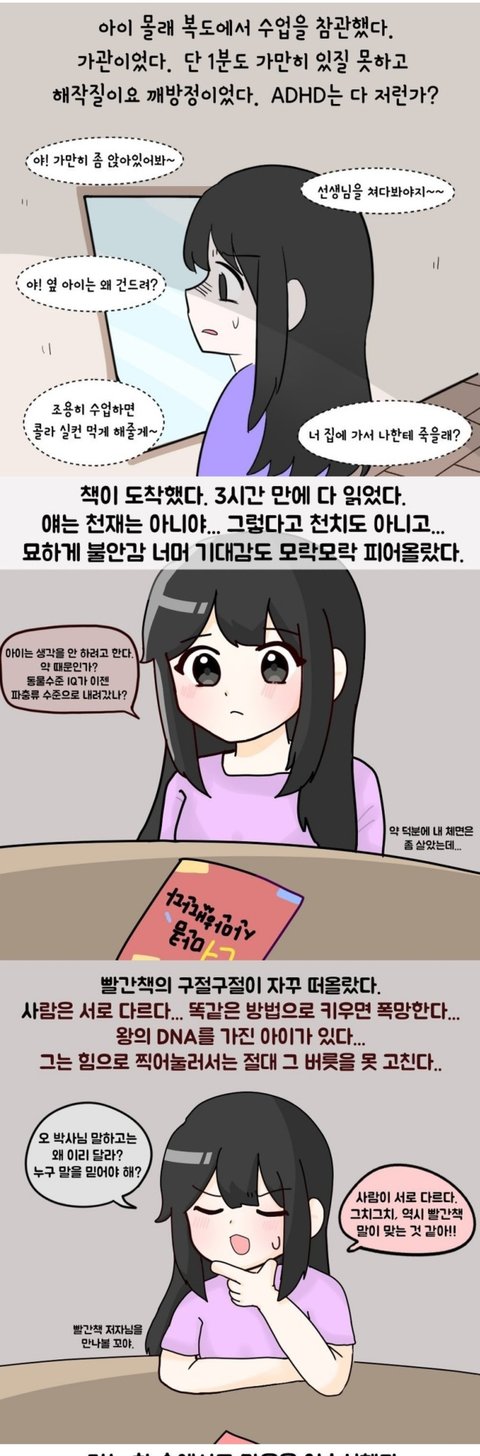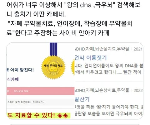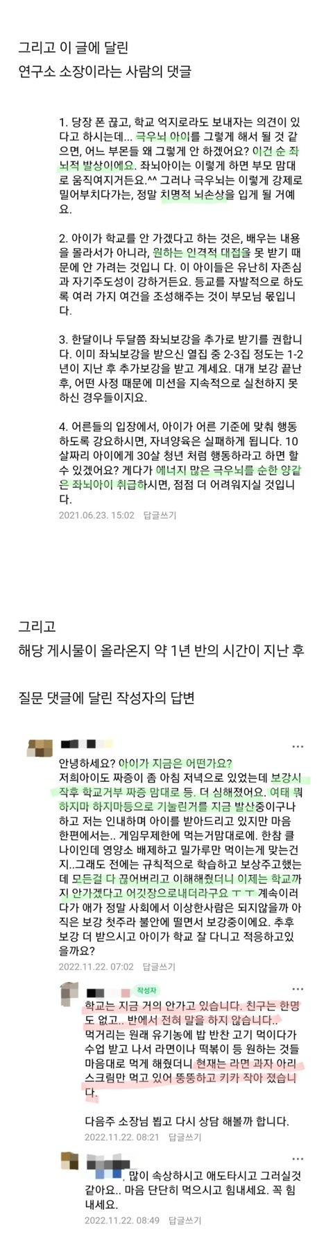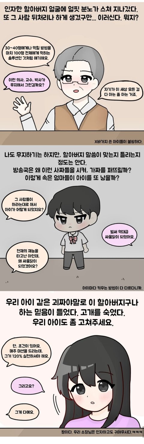 절박한 심정에 썩은 동앗줄이라도 잡으려는 부모들 등쳐먹는 저 사이비돌팔이부터 잡아족쳐야 할 듯. 저거 사기죄로 고발해서 잡아가둘 수 없나? ADHD 요즘 약 좋아져서 약만 먹어도 훨씬 좋아질 수 있고 엄격한 훈육을 통해 잘 클 수 있는 아이들을 바보 짐승으로 만들어버리네. 저 원장인가 뭔가 하는 할배가 제일제일 나쁜 인간이다.