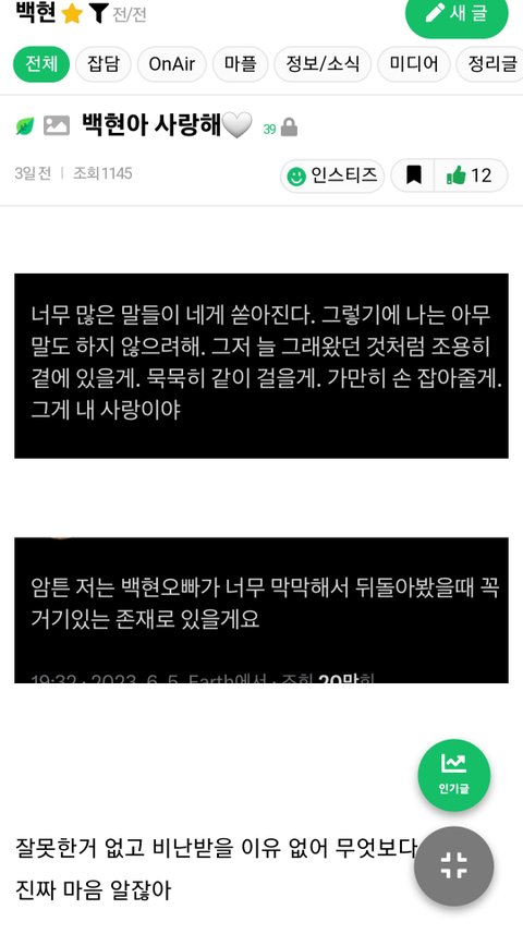 + 탈덕문이라고 올리는 팬(남의 버블 사진 가져와서 인증하는 팬코말고) 다시 돌아오지 말아주라. 내용보니까 결국 망상이 반이고 정병들이 날조하고 다니던 그 내용대로 썼던데 오래된 팬이라면 여기서 백현이 가장 많이 욕 먹는 것도 알았을텐데 판에다 그렇게 먹잇감을 줬다는 건..음...걍 조용히 가고 제발 돌아오지 말아줘