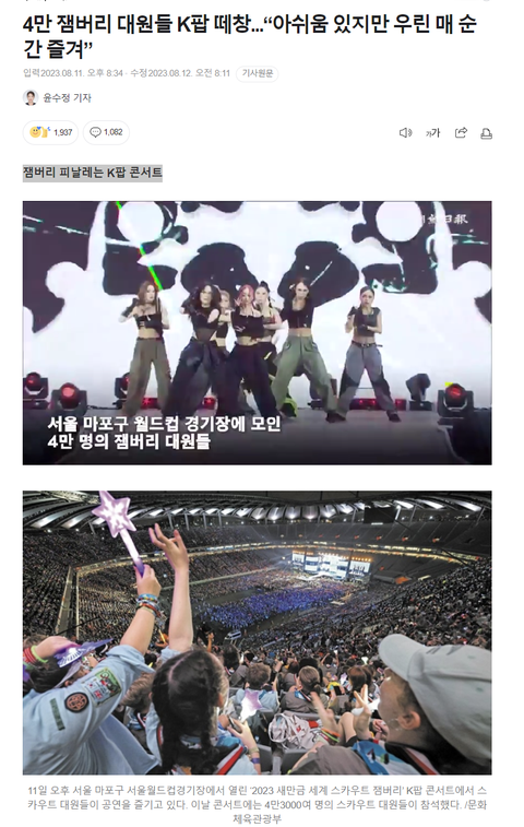 뉴진스, 아이브, NCT드림, 제로베이스원 등 인기 K팝 스타 19팀이 총출동한 가운데 153국 4만3000명 대원들이 참석했다. 다른 나라보다 일찍 새만금 야영지를 떠났던 영국·미국·싱가포르 대표단의 대부분 대원도 함께 자리했다. 캐나다 스카우트 대원 줄리언(15)은 “이번 잼버리 본행사에 수차례 실망했다. 그래도 한국이 마지막까지 우릴 위해 노력해 줘서 고맙다”고 했다. 스웨덴 스카우트 대원 안드레아 지벤(17)은 “K팝을 정말 좋아한다. 일정 내내 많이 힘들었지만 마지막엔 즐거움이 남게 됐다”고 했다.