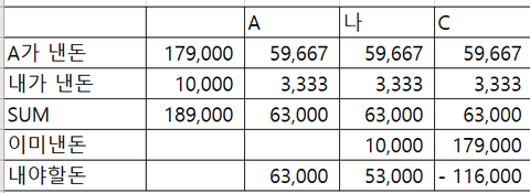 2.C 라는 친구가 10,000원에는 내 몫도 있으니 6,667원만 계산해야 하는게 아니냐고 말함,그래서 그 만원도 포함해서 계산이 된거고 만약에 내가 59,667원을 내야 하는건데 만원에서 내몫 3,333원을 뺀다고 하더라도 59,667-6,667=53,000원 내야 되는 돈은 동일하다고 알려줬음.