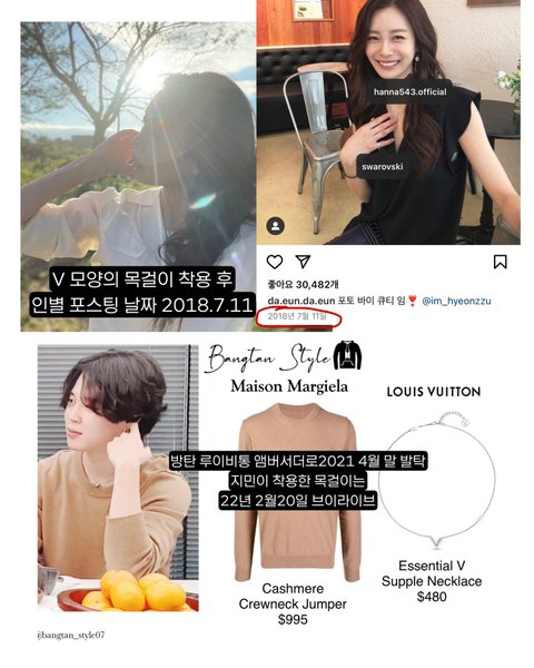 > 방탄이 루이비통 앰버서더로 2021 4월 말에 발탁 후, 지민 V 모양의 루이비통 목걸이는 22.2.20 브이라이브에서 처음 목격됨
