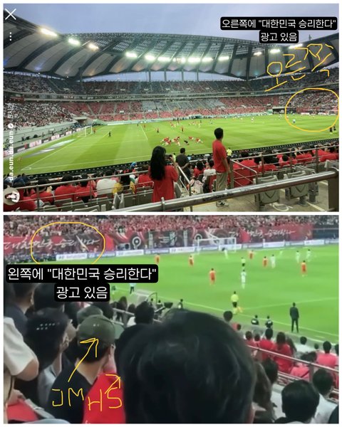 > "대한민국 승리한다"라는 광고가 지민의 좌석에서는 왼쪽에 위치함