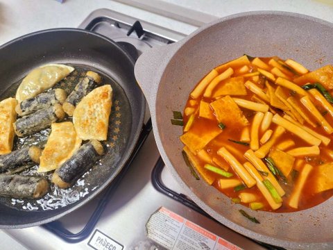 냉동실을 털어 튀김들을 꺼내고, 떡볶이를 만들었어요.