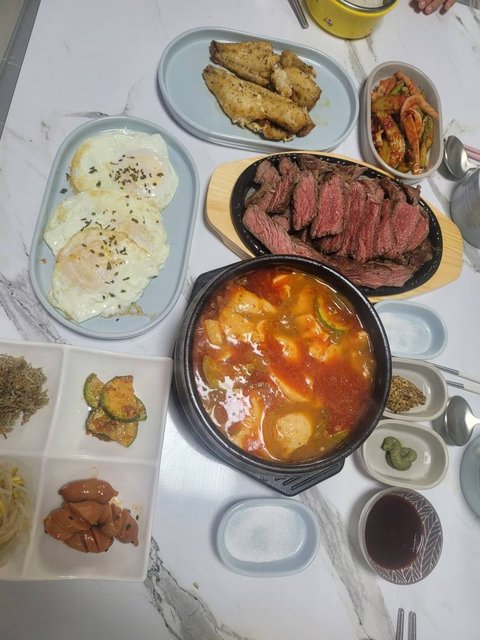제가 구워주는 스테이크 참 좋아하는 우리 식구들